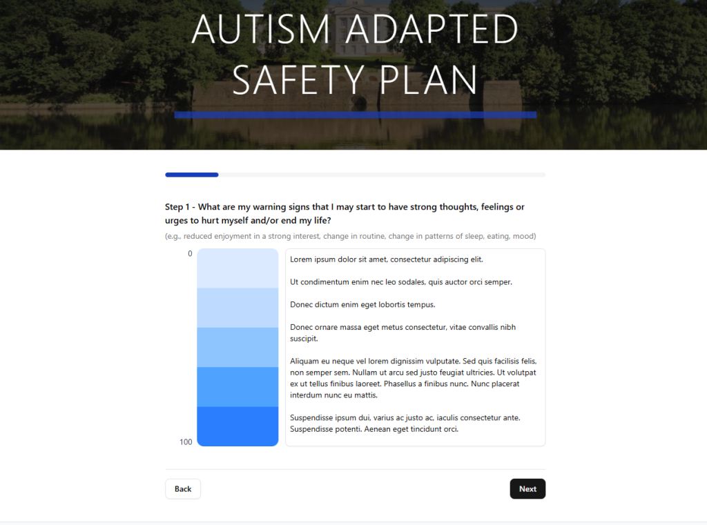A digital adaptation of an evidence-based pencil-and-paper intervention developed with NIHR funding to help prevent self-harm in autistic adults. This privacy-focused, frontend-only web application increases accessibility and personalisation of the intervention, guiding users through a structured approach to identifying coping strategies, warning signs, and support contacts – all stored securely in the browser with no data leaving the user’s device.